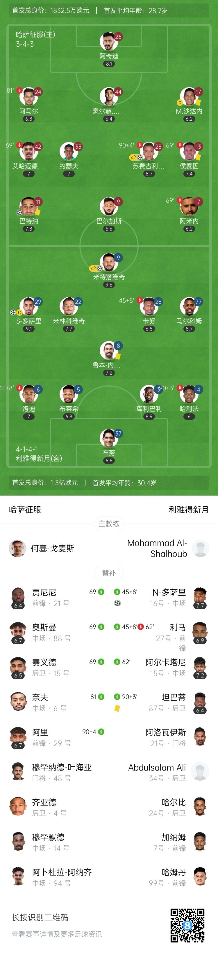 全场比赛结束,利雅得新月4-3哈萨征服。
