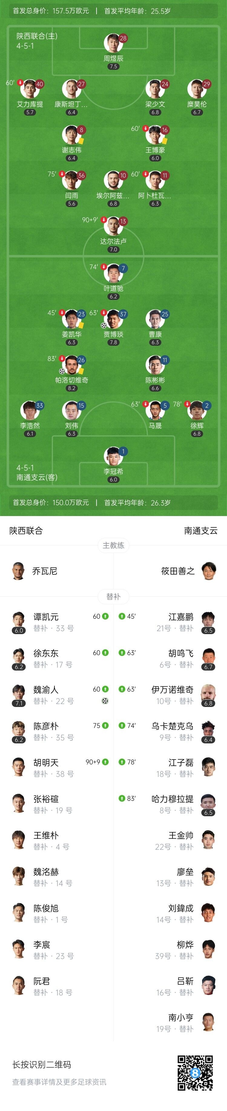 伤停补时7分钟。全场比赛结束,陕西联合3-2南通支云。
