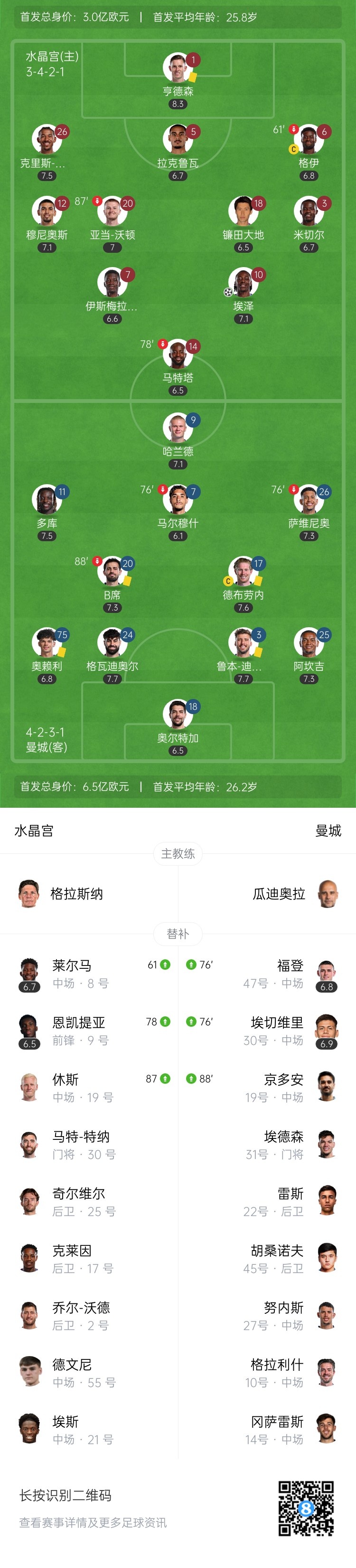 全场比赛结束,最终曼城0-1水晶宫。