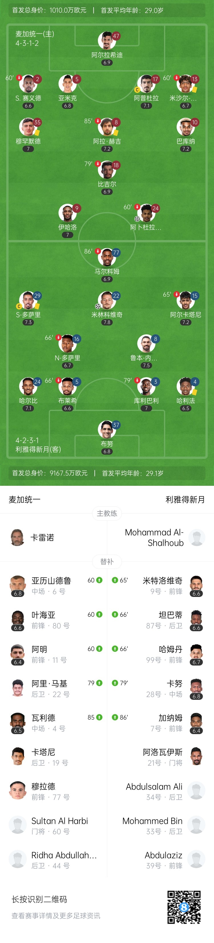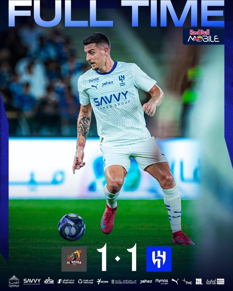下半场补时9分钟。最终全场比赛结束,麦加统一1-1利雅得新月。