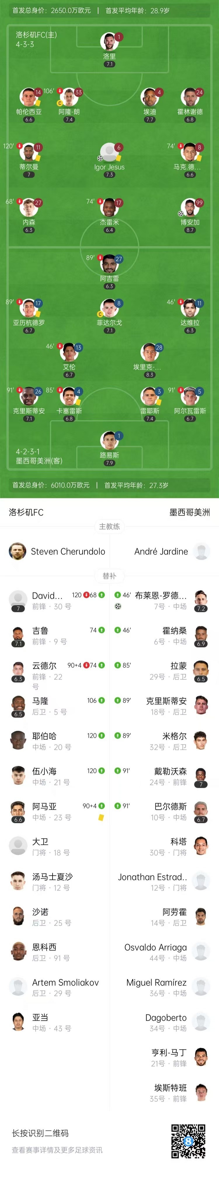 第90分钟,洛杉矶左侧角球开出,伊戈尔头球攻门扳平比分,洛杉矶FC1-1墨西哥美洲。↓