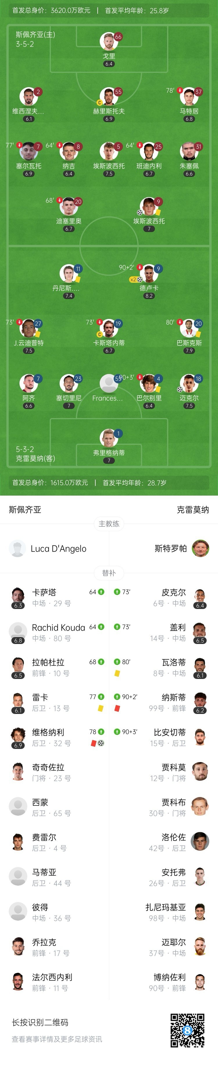 全场比赛结束,克雷莫纳总比分3-2险胜斯佩齐亚升入意甲。