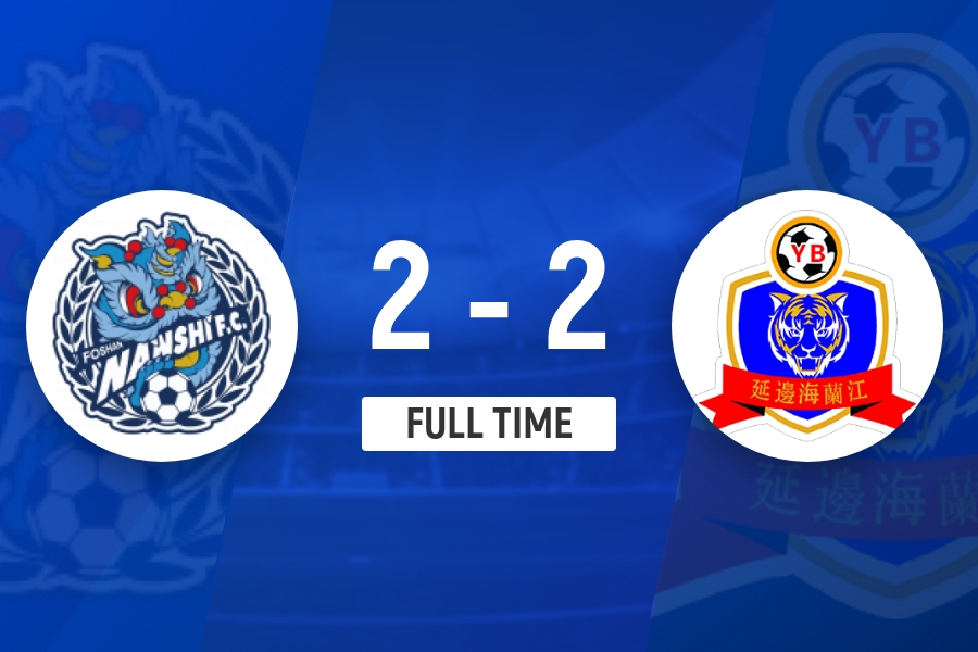 下半场补时5分钟,佛山龙狮2-2延边龙鼎。