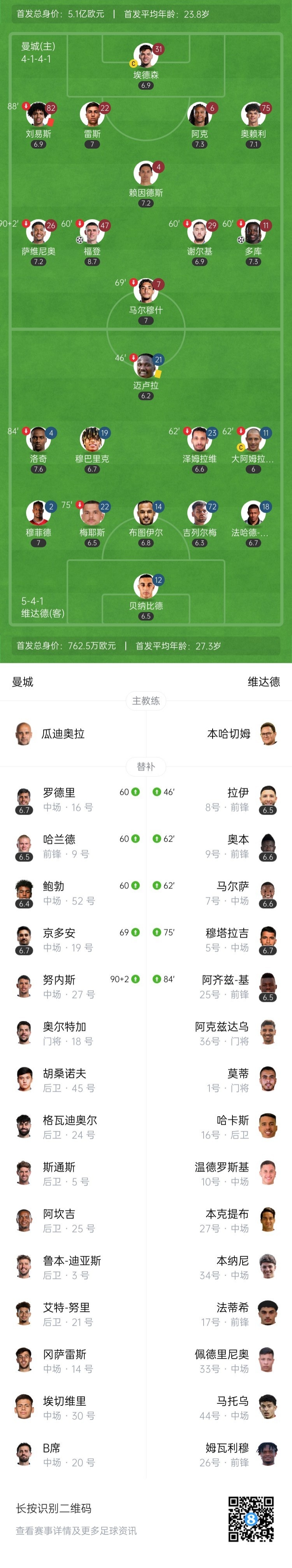 下半场伤停补时6分钟,全场比赛结束,最终曼城2-0维达德。