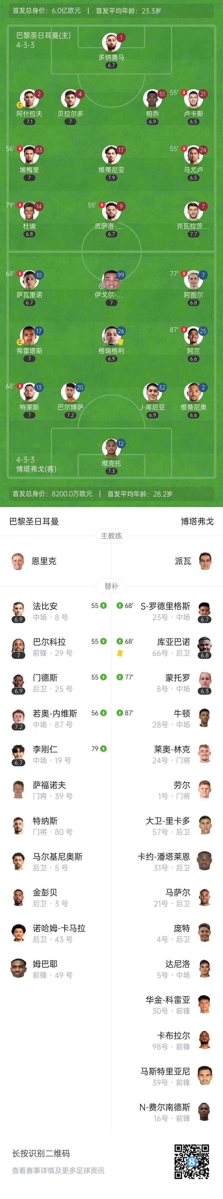 第2分钟,克瓦拉茨赫利亚内切兜射,维克托将球扑出,大巴黎敲山震虎。↓