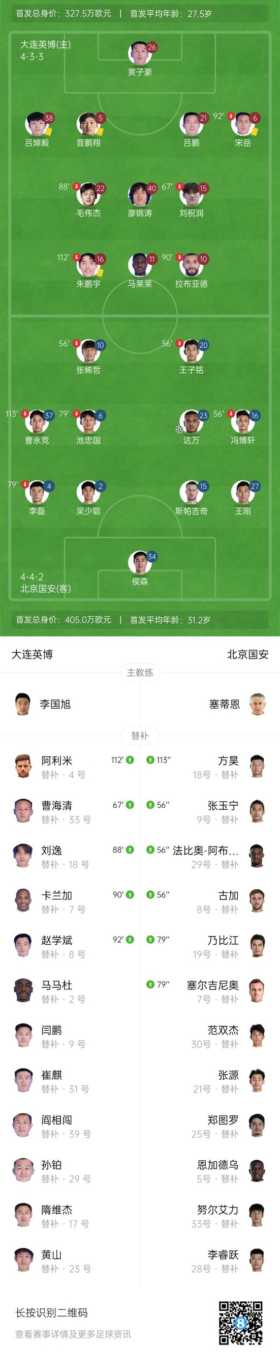 下半场补时11分钟,大连英博1-1北京国安。