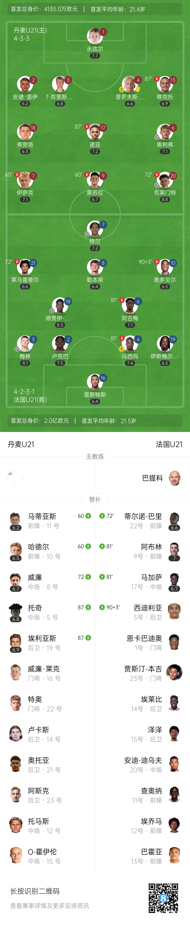下半场伤停补时3分钟,全场比赛结束,最终法国U21以3-2逆转丹麦U21。