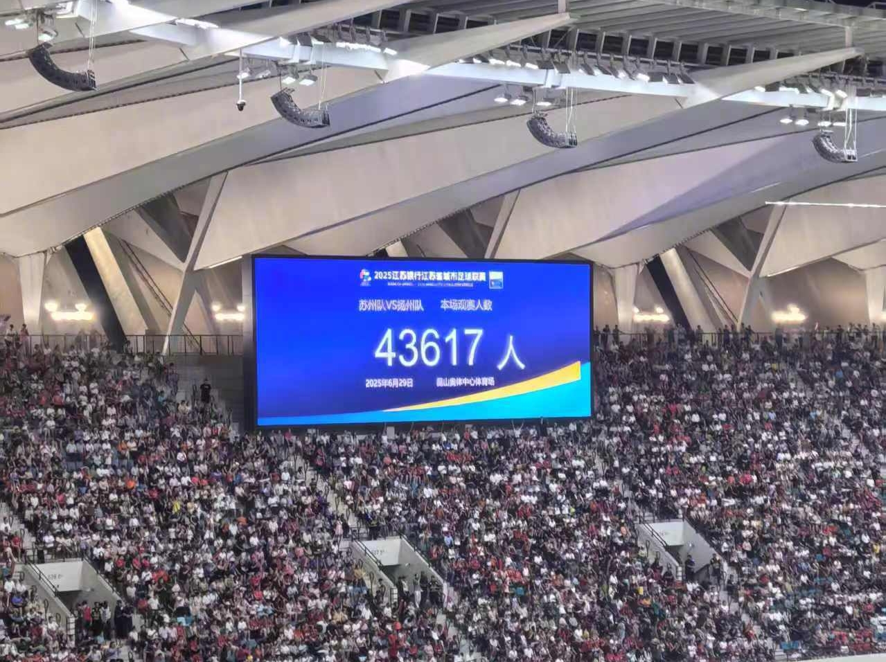 下半场现场广播宣布,本场比赛昆山奥体中心上座人数为43617人,再度刷新了“苏超”上座纪录!